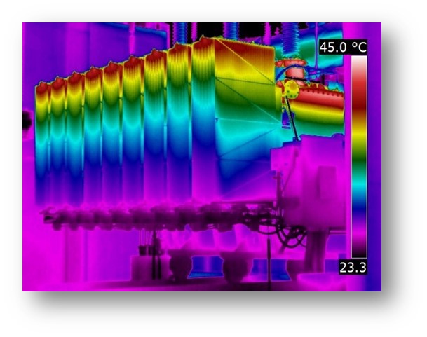 La siguiente imagen muestra, esencialmente, cómo debe ser la distribución típica de un termograma para un transformador de potencia, en condiciones normales de operación bajo el parámetro de temperatura, al momento de una inspección termográfica.